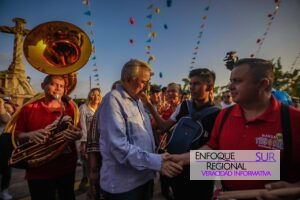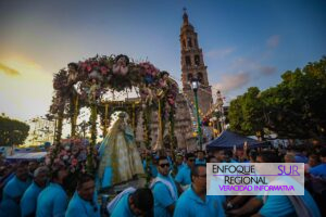 Rocha Moya y la comitiva invitada recorrieron a pie las principales calles del centro histórico detrás de la Virgen, acto que fue ambientado con las canciones de una banda sinaloense que alegró a turistas y locales por igual.