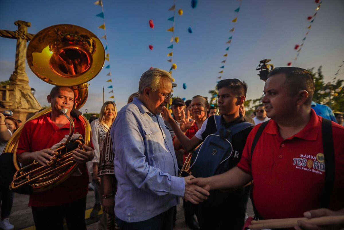 Rocha Moya y la comitiva invitada recorrieron a pie las principales calles del centro histórico detrás de la Virgen, acto que fue ambientado con las canciones de una banda sinaloense que alegró a turistas y locales por igual.