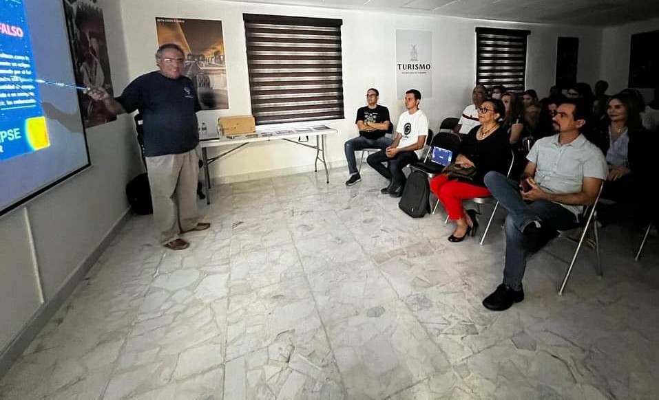 Miembro de la Sociedad Astronómica Mazatlán, Daniel Hernández Cárdenas, expuso ante el personal de la SECTUR, una reseña instructiva del fenómeno a través de diferentes culturas y épocas hasta la modernidad, explicando los procesos que se derivan del efecto que produce la luna al tapar el sol.